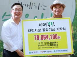 대전시는 21일 계족산 숲속음악회장에서 ㈜맥키스컴퍼니 조웅래 회장이 대전인재육성장학재단 이사장인 이장우 대전시장에게 대전사랑 장학금 7,996만 원을 전달했다고 밝혔다.이날 기탁된 장학금은 2019년