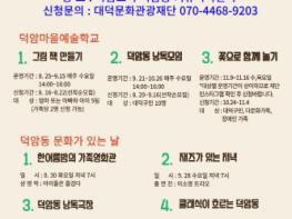 대덕문화관광재단은 ‘내 일상이 즐거운 대덕구’를 만들기 위해 마을예술창작소를 본격 추진한다고 21일 밝혔다.마을예술창작소는 대덕문화관광재단의 대표적인 문화향유사업으로 구민이 마을에서 문화예술