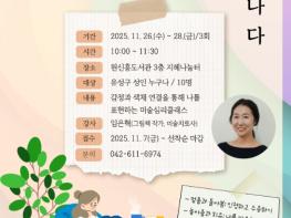 대전 유성구는 26일부터 28일까지 원신흥도서관에서 성인을 대상으로 미술 심리 클래스 ‘감정의 팔레트, 나와 내가 만나다’를 운영한다.이번 특강은 미술을 매개로 한 심리 활동을 통해 한 해를 성찰하며