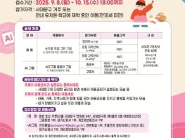 서대문구가 11월 셋째 주 아동권리주간을 기념해 10월 15일까지 ‘손으로 쓱, AI로 짠! 2025년 아동권리 그림 공모’를 진행한다.특히 올해는 기존 ‘회화’에 더해 ‘AI 생성형 그림’ 분야를 신설했으며