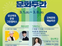 서울 강북구는 개청 30주년을 기념하여 오는 3월 1일(토)부터 8일(토)까지 '강북 문화주간'을 운영한다고 밝혔다. 이번 행사는 강북문화예술회관, 성신여대 운정그린캠퍼스 등에서 다채로운 문화 프로그램