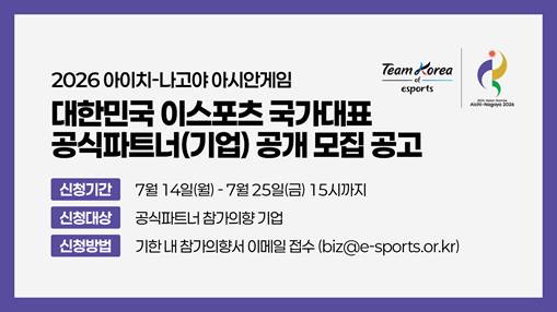 [스포테이너즈=고초록 기자] 한국e스포츠협회(이하 협회)가 2026년 일본 아이치·나고야 아시안게임 출전에 나서는 이스포츠 국가대표팀을 지원할 공식 파트너사를 공개 모집한다고 14일 밝혔다.협회…