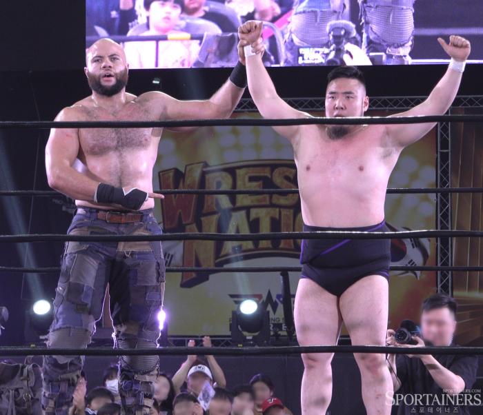 지난 10일, 서울 KBS 아레나에서 열린 'PWS 레슬네이션' 에서 멋진 경기를 펼친 조던 오아시스(좌)와 하다온(우). 경기 결과는 하다온의 '저 세상 센턴'에 이은 3카운트 핀폴 승 / 고초록 기자…