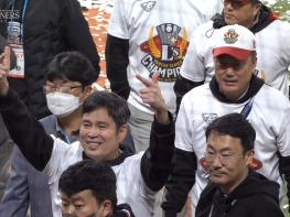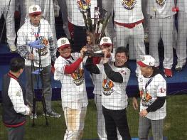 [인천=스포테이너즈] SSG 랜더스가 어제(8일) 인천 SSG 랜더스 필드에서 열린 2022 KBO 한국시리즈 6차전 - 키움 히어로즈와의 시리즈에서 우승한 직후 정용진 구단주, 민경삼 대표이사, 김원형 감독, 한유…
