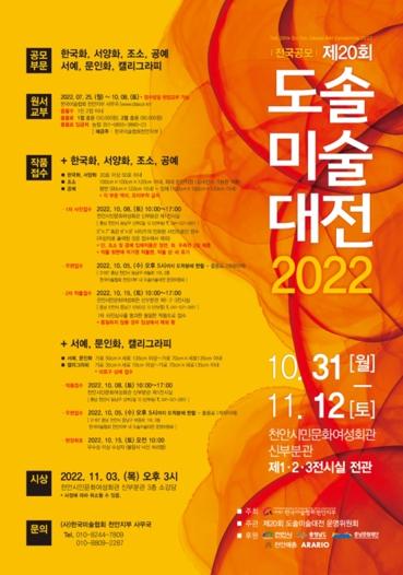 [스포츠와 엔터테인먼트의 만남 '스포테이너즈(SPORTAINERS)', 안봉준기자] 천안시가 지원하고 사단법인 한국미술협회 천안지부가 주최·주관하는 ‘제20회 도솔미술대전’이 10월 31일부터 11월 12일까지 천안신부문화회관 제1·2·3전시실에서 열린다.