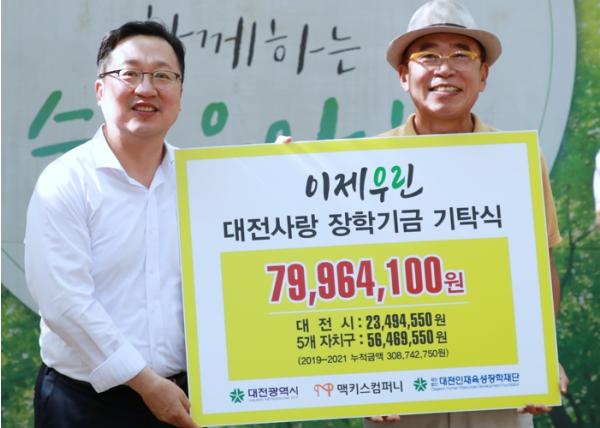 대전시는 21일 계족산 숲속음악회장에서 ㈜맥키스컴퍼니 조웅래 회장이 대전인재육성장학재단 이사장인 이장우 대전시장에게 대전사랑 장학금 7,996만 원을 전달했다고 밝혔다.