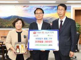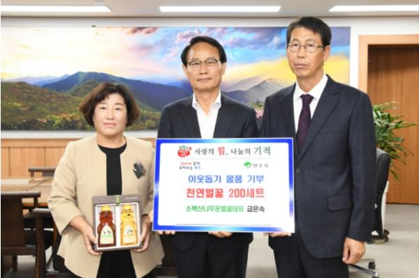 [스포츠와 엔터테인먼트의 만남 '스포테이너즈(SPORTAINERS)', 고초록기자] 소백산나무꾼벌꿀은 지역 내 어려운 이웃에게 전해달라며 2일 영주시청을 방문해 천연벌꿀(1.1kg) 200세트(720만원 상당)를 기부했다.