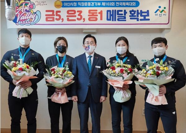[스포츠와 엔터테인먼트의 만남 '스포테이너즈(SPORTAINERS)', 고초록기자] 박경귀 아산시장이 지난 3일 제103회 전국체육대회에서 금5, 은3, 동1을 획득하며 스포츠 도시 아산의 위상과 잠재력을 알린 아산시청 직장운동경기부 선수단을 격려하고 환담하는 시간을 가졌다.