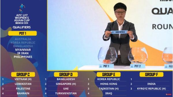 3일(한국시간) 말레이시아 쿠알라룸푸르에서 2024 AFC U-17 여자 아시안컵 1차 예선 조추첨이 실시됐다. 한국은 홍콩, 타지키스탄, 이라크와 E조에 속했다. E조는 내년 4월 타지키스탄에서 모든 경기를 치른다. 이 대회에 출전하게 될 여자 U-15 대표팀은 현재 호주에서 전지훈련을 하고 있다.