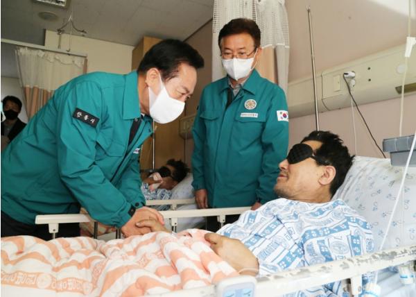 [스포츠와 엔터테인먼트의 만남 '스포테이너즈(SPORTAINERS)', 고초록기자] 권기창 안동시장은 5일 안동병원에서 토사 붕괴로 매몰된 지 221시간 만에 극적으로 구조된 경북 봉화 아연 광산 생환자를 만나 진심 어린 쾌유를 기원했다.