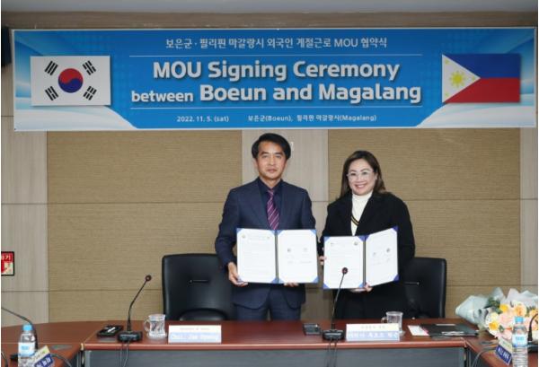 [스포츠와 엔터테인먼트의 만남 '스포테이너즈(SPORTAINERS)', 고초록기자] 보은군은 지난 5일 필리핀 마갈랑시와 농촌 인력난 해소를 위한 외국인 계절근로자 도입 업무협약(이하 MOU)를 체결했다고 7일 밝혔다.