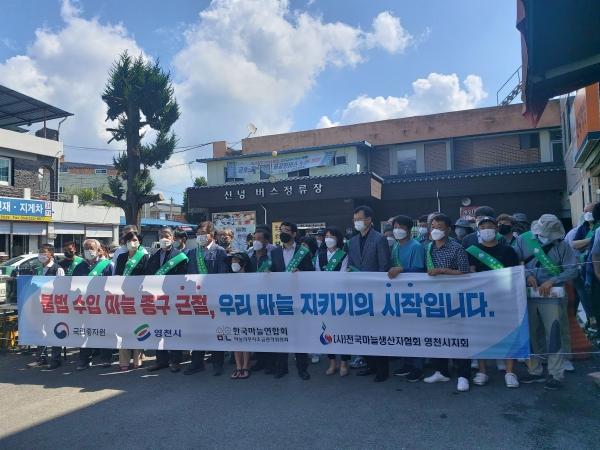 영천시는 지난 18일 본격적인 마늘 종구(씨마늘) 유통시기를 맞아 국립종자원, (사)전국마늘생산자협회, 마늘의무자조금관리위원회, 관내농협 등 관련 기관 및 단체와 함께 ‘수입산 마늘 종구 사용금지 캠페인’을 실시했다.