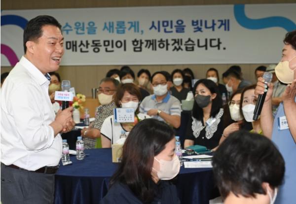 이재준 수원특례시장은 민선8기 출범 이후 시민들과의 소통에 방점을 뒀다. 대표적인 사업이 ‘시민이 꿈꾸는 수원이야기’다. 시장이 취임 직후 수원지역 4개 구와 44개 동 주민들을 직접 만나 대화하는 자리를 마련했다. 7월7일부터 10월12일까지 100일에 가까운 기간 동안 총 4천260명이 참여했다. 주요 참석자는 구와 동에서 활동하는 각종 주민단체와 지역사회의 주요 구성요소가 되는 학교·기관·단체의 대표, 주민대표 등 ‘우리동네’를 살아가는 주민이었다. 이 자리에서 시장과 시민들은 직접 눈을 맞추며 인사를 나누고 새로운 시정 구상을 설명한 것은 물론, 시민들이 진짜 원하는 사업이 무엇인지 가감없는 대화를 이어갔다.