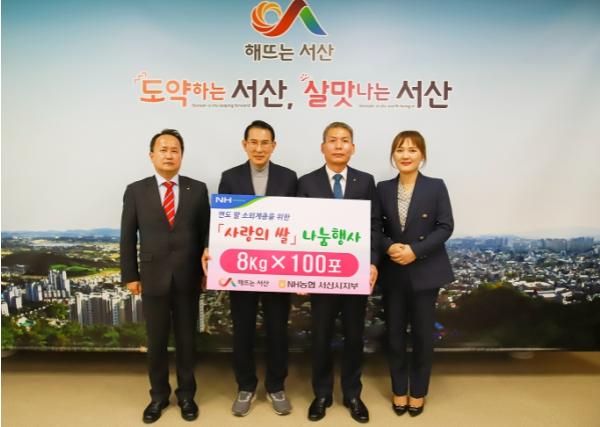 기탁식은 서산시청 시장실에서 열렸으며, 이완섭 서산시장, 이성구 지부장, 임진흥 농협은행 서산시지부 지점장, 이은미 농협은행 서산시지부 총무과장이 참석했다.