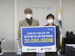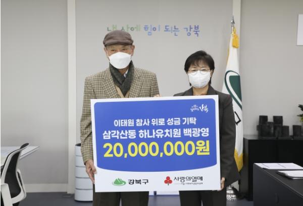 [스포츠와 엔터테인먼트의 만남 '스포테이너즈(SPORTAINERS)', 고초록기자] 서울 강북구는 11일(금) 삼각산동 소재 하나유치원 백광영(남; 82세) 대표가 이태원 참사 위로 성금으로 2천만원을 기부했다고 밝혔다.