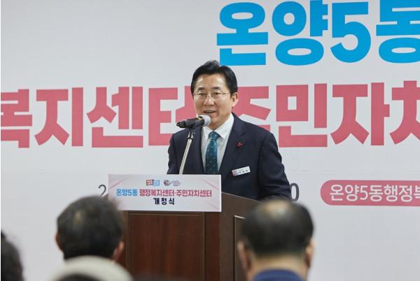 박경귀 시장은 기념사에서 “17개 읍면동 열린간담회에서 가장 많이 들어온 민원이 ‘행정센터 신청사 건립 요청’이었을 만큼 관내에 오래된 청사가 많다”면서 “엄청난 예산이 드는 일이라 순차적으로 해나가고 있는데 그 중 온양5동이 가장 먼저 신청사를 갖게 됐다는 건 그만큼 온양5동 주민 여러분들이 오랫동안 불편함과 인내를 감내하셨다는 뜻이다. 그동안 복잡하고 비좁은 청사 이용하느라 고생 많으셨다”고 말했다.