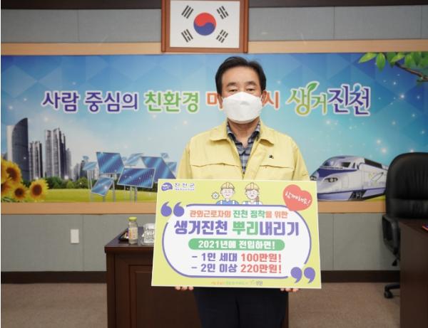 해당 사업은 다른 지역에 2년 이상 주민등록을 두고 있다가 진천으로 전입한 기업체 근로자 1인 세대에 100만원, 2인 이상 세대 220만 원을 지급하는 진천군의 특수시책이다.