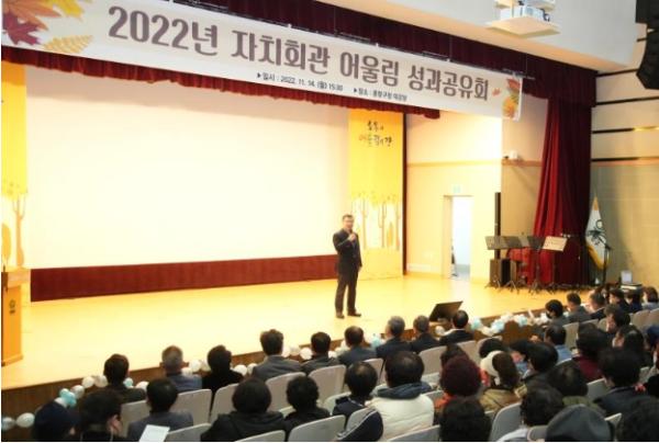 [스포츠와 엔터테인먼트의 만남 '스포테이너즈(SPORTAINERS)', 고초록기자] 중랑구가 지난 14일 오후 3시 30분, 중랑구청 지하대강당에서 한해 동안의 자치회관 활동을 공유하는 ‘2022년 자치회관 어울림 성과공유회’를 개최했다.