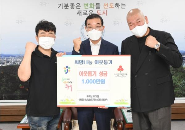대전 중구는 19일, 유튜브 ‘버거형’을 운영하는 박효준 배우와 ‘선화동소머리해장국’ 박덕규 대표로부터 이웃돕기 성금 일천만 원을 기탁받았다고 밝혔다. 이날 기탁된 성금은 관내 어려운 이웃을 위해 쓰인다.