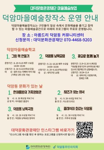 마을예술창작소는 대덕문화관광재단의 대표적인 문화향유사업으로 구민이 마을에서 문화예술을 즐기고 참여할 수 있도록 마을별 거점예술공간을 운영하는 사업이다.