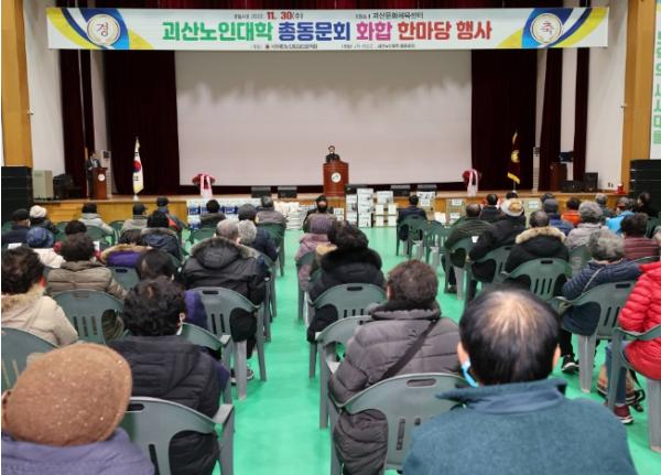 최초로 개최한 이날 행사에는 송인헌 괴산군수와 신송규 군의회 의장 등 기관 단체장과 괴산군지회 경한호 지회장을 비롯해 박노적 노인대학장, 구오권 총동문회장과 총동문회 회원 300여 명이 참석한 가운데 진행됐다.