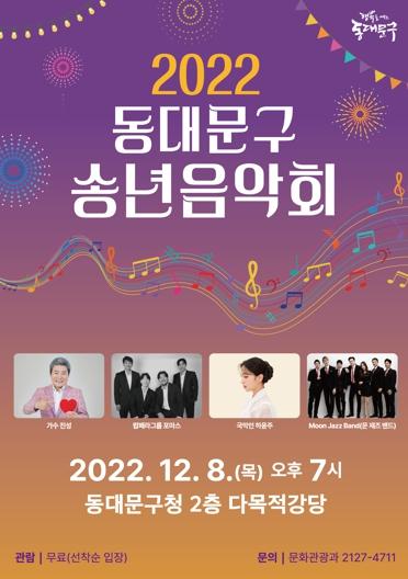 이필형 동대문구청장은 “한해가 저무는 12월, 갑자기 다가온 추위를 조금이나마 녹이고 좋은 추억이 되기를 바라는 마음에서 송년음악회를 준비했다”며 “희망찬 새해를 준비하는 설레는 송년, 서로에게 따뜻한 말 한마디와 격려를 나누는 따뜻한 송년, 송년음악회에서 따뜻하고 행복하게 한 해를 마무리하실 수 있길 바란다” 고 전했다.