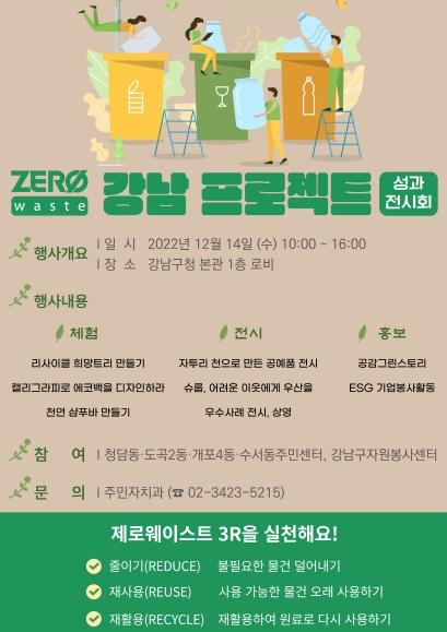 ‘ZERO 강남 프로젝트’는 각 동주민센터를 중심으로 주민, 직능단체, 자원봉사센터, 기업 등 민관협력을 통해 기후 위기에 대응하는 강남구의 선제적인 제로웨이스트 실천 사업이다. 일회용품 사용 등으로 일어나는 환경오염의 심각성을 구민에게 알리고, 올바른 분리배출 문화 정착 및 실질적 쓰레기 감축을 위해 추진됐다.