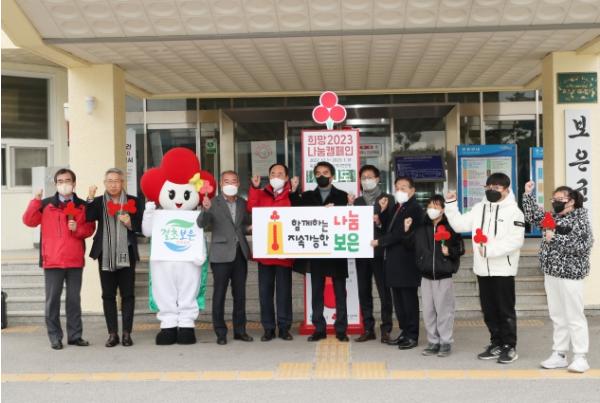 희망 2023 나눔캠페인은 연말연시 저소득층과 복지 소외계층 지원을 위해 ‘함께하는 나눔, 지속가능한 충북’이라는 슬로건을 걸고 내년 1월 31일까지 62일간 진행되며, 기부를 희망하는 분은 보은군 성금 계좌 농협 313-01-148535(예금주: 충북공동모금회)로 참여할 수 있다.