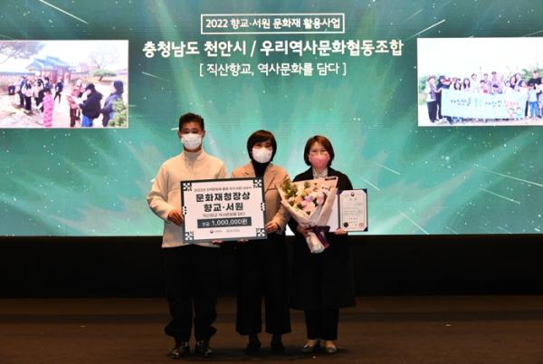[스포츠와 엔터테인먼트의 만남 '스포테이너즈(SPORTAINERS)', 안봉준기자] 천안시와 우리역사문화협동조합이 운영한 향교·서원 문화재 활용 사업 ‘직산향교 역사문화를 담다’가 2022년 지역문화재 활용 우수사업으로 선정돼 문화재청장상을 수상했다.