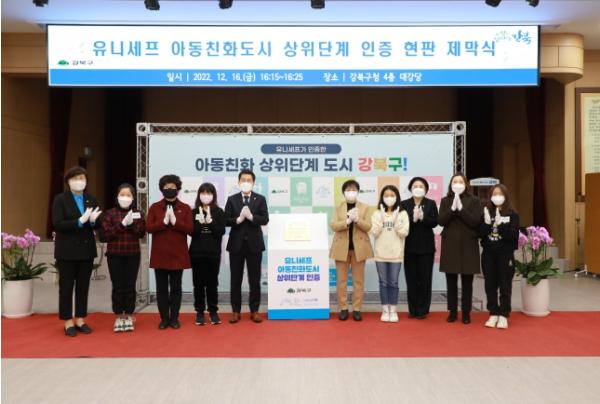 [스포츠와 엔터테인먼트의 만남 '스포테이너즈(SPORTAINERS)', 안봉준기자] 서울 강북구는 16일(금) 유니세프 아동친화도시 상위단계 인증 현판 제막식을 구청 대강당에서 개최했다.