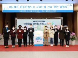 구는 2018년 9월 유니세프한국위원회로부터 아동친화도시 첫 인증을 받은 데 이어 지난달 11일 추가적으로 받은 상위단계 인증을 기념하기 위해 이번 현판 제막식을 개최했다.