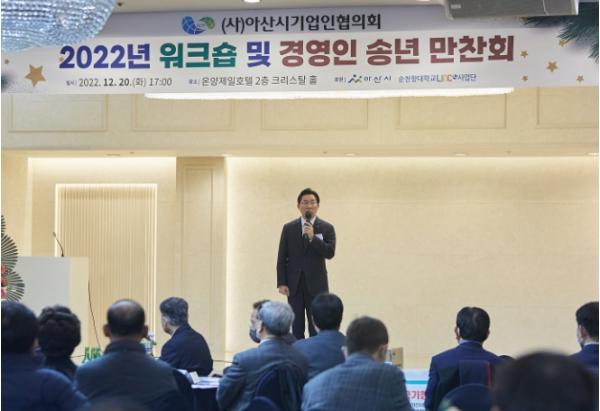행사 1부 워크숍에서는 오광옥 충남경제진흥원 원장의 ‘인문 경영’ 특강이 진행됐고, 2부 본 행사에서는 아산시립합창단의 축하 공연과 우수기업인 및 모범근로자 표창 수여, 송년사, 축사가 이어졌다. 마지막 3부는 만찬으로 기업 경영인들이 한 해 성과를 축하하고 소통하며 화합과 결속을 다지는 시간을 가졌다.