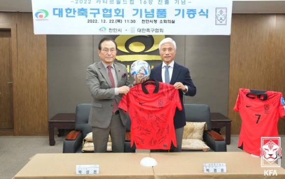 대한축구협회(KFA)는 22일 천안시청에서 열린 ‘카타르 월드컵 16강 진출 기념품 기증식’에서 월드컵 대표팀 선수들이 친필 사인한 유니폼과 축구공을 천안시에 기증했다. 이 자리에는 박상돈 천안시장, 박경훈 KFA 전무 등 천안시와 KFA 관계자들이 참석했다.