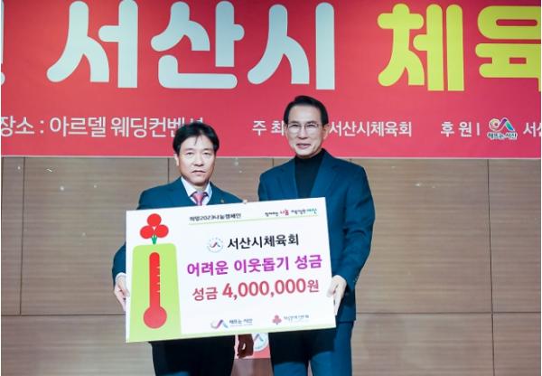 서산시체육회 주관으로 열린 이번 행사에는 어려운 이웃을 돕기 위해 체육회 임직원과 읍?면?동 체육회 등 회원종목단체에서 모은 성금 400만 원을 충남사회복지공동모금회에 전하는 성금 전달식이 진행됐다.