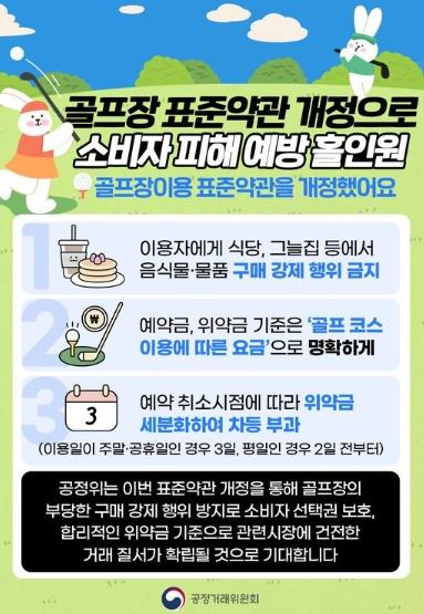 공정위는 이번 표준약관 개정을 통해 골프장의 부당한 구매 강제 행위 방지로 소비자 선택권보호, 합리적인 위약금 기준으로 관련시장에 건전한 거래 질서가 확립될 것으로 기대한다고 전했다.