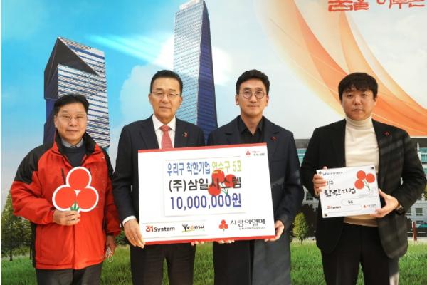 이번 후원으로 ㈜삼일시스템은 인천사회복지공동모금회의 모금캠페인 중 하나인 ‘우리구 착한기업’ 연수구 5호점에 가입하며 현판을 받게됐다.