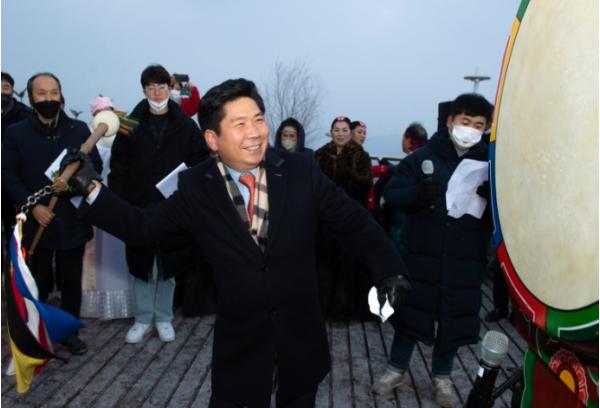 [스포츠와 엔터테인먼트의 만남 '스포테이너즈(SPORTAINERS)', 안봉준기자] 제천시는 2023 새해 첫날 비봉산 정상에서 김창규 시장을 비롯해 이정임 의장, 엄태영 국회의원, 시민 등 400여명이 참석한 가운데 청풍호반 케이블카 일원에서 ‘2023년 새해맞이 시민화합 해맞이 행사’를 개최했다.