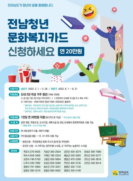 김영록 전남도지사는 “전남청년 문화복지카드 지원사업은 전국 최초로 소득기준 없이 문화비를 지원하는 청년 시책으로 올해는 더 많은 청년에게 혜택을 주기 위해 지원 연령을 확대했다”며 “세계로 웅비하는 대도약 전남 행복시대의 중추적 역할을 할 청년의 꿈과 희망을 응원하고 돕겠다”고 말했다.