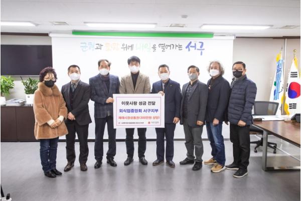 강범석 서구청장은 “지역의 어려운 이웃을 잊지 않고 꾸준히 따뜻한 사랑을 나눠주신 서구외식업지부에 감사드린다”며 “회원분들이 모아주신 소중한 성금이 도움이 필요한 이웃에게 잘 전달될 수 있도록 최선을 다하겠다”고 밝혔다.