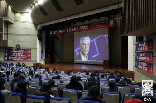 2023 대한축구협회(KFA) U-12 지도자 컨퍼런스가 26일 대전 KT인재개발원에서 열렸다. 이 자리에는 전국의 U-12 지도자 200여 명이 모였다. 발표자로는 이임생 KFA 기술발전위원장을 비롯해 최성환 지도자강사, 오성환 피지컬 전임지도자가 나섰다. 뒤이어 최광원 초등분과위원장을 비롯한 KFA 관계자들이 이번 시즌 초등 대회 정책을 소개하고, 올해부터 초등부 경기에 도입하는 1심제에 대해 설명했다.