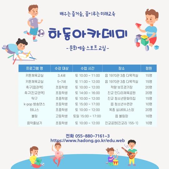 [스포츠와 엔터테인먼트의 만남 '스포테이너즈(SPORTAINERS)', 안봉준기자] 하동군은 영유아와 청소년을 대상으로 내달 4일 문화·예술·스포츠 분야의 2023년도 하동아카데미를 개설키로 하고 오는 17일까지 수강생을 모집한다고 2일 밝혔다.