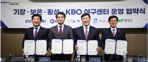 협약식에는 KBO 허구연 총재를 비롯해 KBO 야구센터에 참여하는 3개 지자체의 정종복 기장군수, 최재형 보은군수, 김명기 횡성군수가 참석하여 KBO 야구센터 운영 협약서에 서명했다.