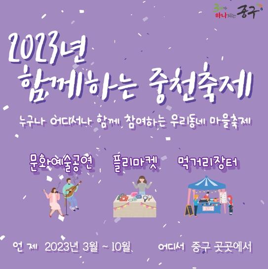 대전 중구는 3월 1일부터 중구 어디서 누구나 함께하는 ‘2023년 함께하는 중천(中川)축제’를 개최한다고 밝혔다.