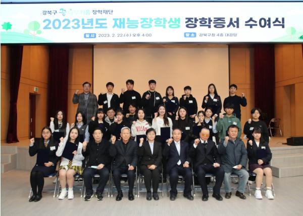 [스포츠와 엔터테인먼트의 만남 '스포테이너즈(SPORTAINERS)', 안봉준기자] 서울 강북구는 지난 22일 강북구청 대강당에서 강북구꿈나무키움장학재단의 제11기 재능장학생으로 선정된 꿈나무 25명에게 장학증서를 수여했다고 밝혔다.