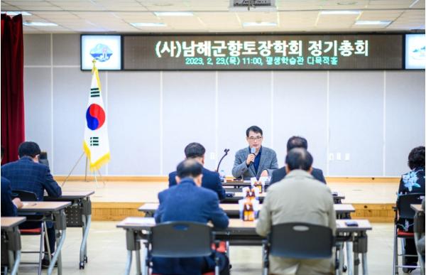 (사)남해군향토장학회가 지난 23일 남해평생학습관에서 장학회 이사장인 장충남 군수를 비롯한 장학회 임원 및 회원 등 74명이 참석한 가운데 2023년도 정기총회를 개최했다.