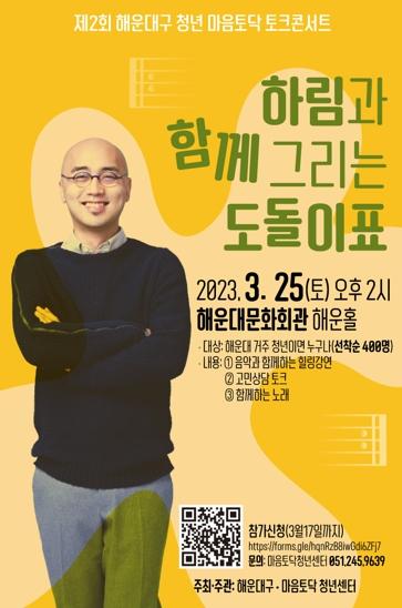 해운대구는 마음토닥 청년센터와 3월 25일 오후 2시 해운대문화회관 해운홀에서‘제2회 해운대구 청년 마음토닥 토크콘서트’를 개최한다.