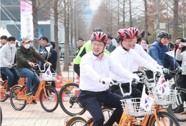 이장우 시장은 “3.1절을 맞아 오랜만에 마스크를 벗고 시민들과 만나게 되어 기쁘다”면서, “자전거는 친환경 교통수단 분담률 높이는 교통수단”이라고 말하며, “ 자전거 기반시설 확충 및 자전거 이용문화 조성을 위해 투자를 확대하겠다”고 밝혔다.