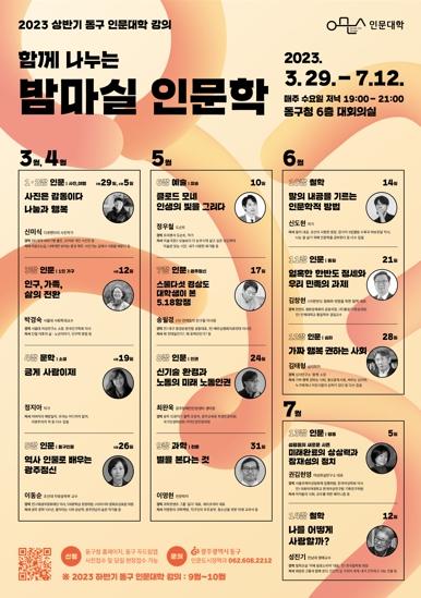 [스포츠와 엔터테인먼트의 만남 '스포테이너즈(SPORTAINERS)', 안봉준기자] 광주 동구는 ‘함께 나누는 밤마실 인문학’을 주제로 다수의 명망 있는 강사들을 모시고 올해 상반기 동구 인문대학을 개강한다고 밝혔다.