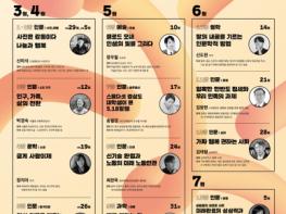 이외에도 ▲이동순 조선대 교수(역사 인물로 배우는 광주정신) ▲정우철 도슨트(클로드모네-인생의 빛을 그리다) ▲송필경(스물다섯 경상도 대학생이 본 5·18항쟁) ▲최완욱 광주장애인인권센터장(신기술 환경과 노동의 미래 노동인권) ▲이명현 천문학자(별을 본다는 것) ▲신도현 작가(말의 내공을 기르는 인문학적 방법) ▲김창현(엄혹한 한반도 정세와 우리 민족의 과제) ▲김태형 사회 심리학자(가짜 행복 권하는 사회) ▲권김현영 여성현실연구소 대표(성평등의 새로운 시즌) ▲성진기 전남대 명예교수(나를 어떻게 사랑할까?) 등 문학, 예술, 철학, 심리 등 다양한 분야의 강사들이 릴레이 강연을 펼친다.
