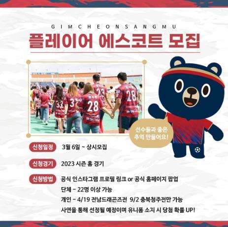 김천상무프로축구단이 6일부터 홈경기 플레이어 에스코트 모집을 시작한다. 플레이어 에스코트는 홈경기 선수단 입장 시 선수단과 함께 손을 잡고 입장하는 팬들이다. 2023 시즌 플레이어 에스코트 모집은 연간 단위로 진행한다.